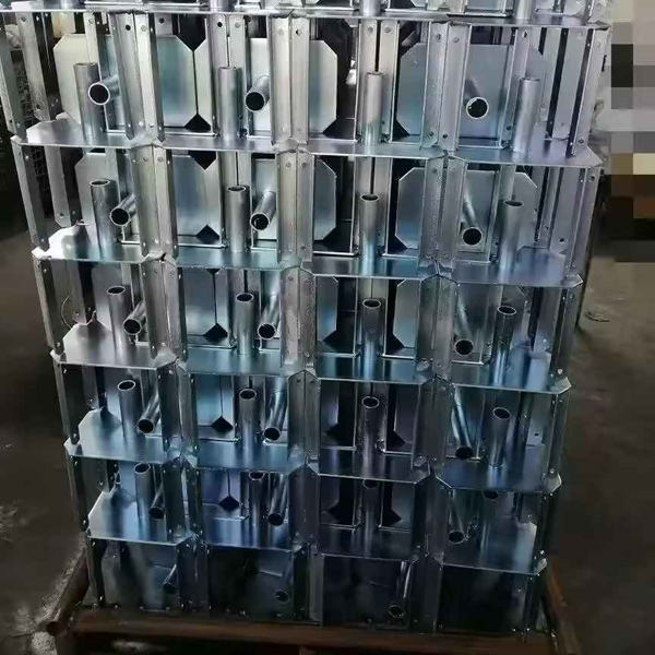 The 4-way angle iron or steel sheet design creates a snug fit for standard H20 beams. This restrictive geometry prevents the beams from rotating or sliding laterally during the concrete pouring process.